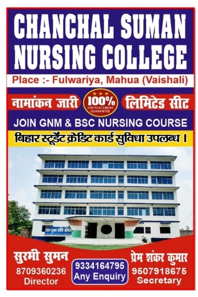 It is a matter of great pride to be a part of Chanchal Suman Nursing College, Mahua, Bihar. Our aim is to empower students with the knowledge, skills, and compassion required in the nursing profession. We are committed to providing quality education and practical training to prepare dedicated healthcare professionals who will serve society with integrity and care.